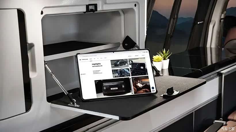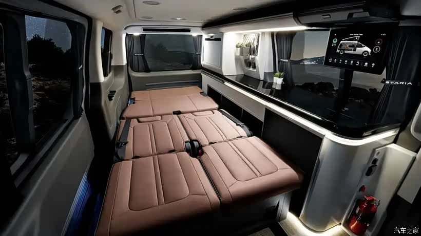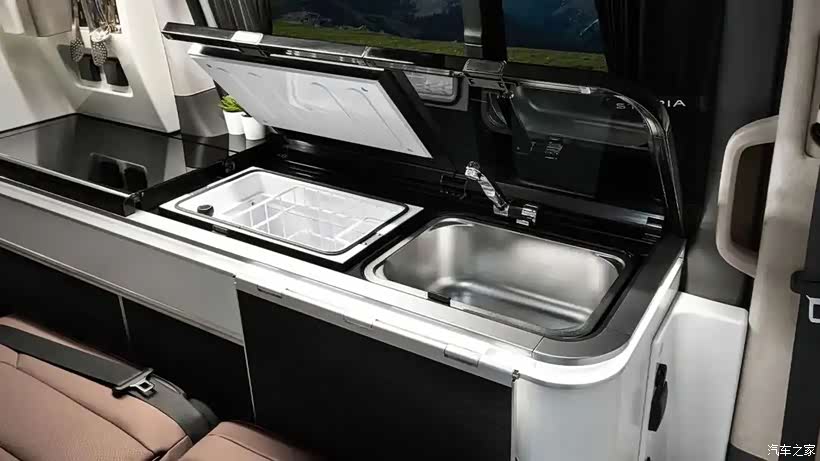 车内的第二排和第三排座椅可以完全放平,变成一个舒适的睡眠空间。四人座车型也加入了水池、冰箱、垃圾桶还有桌板等等十分实用的配置。