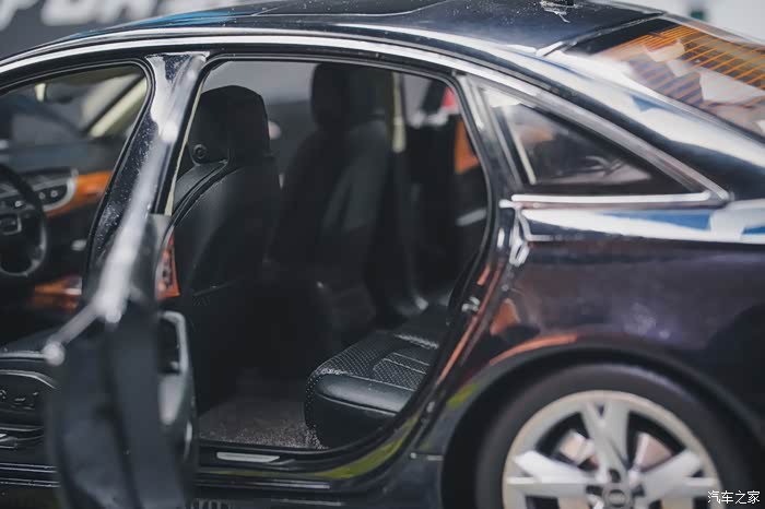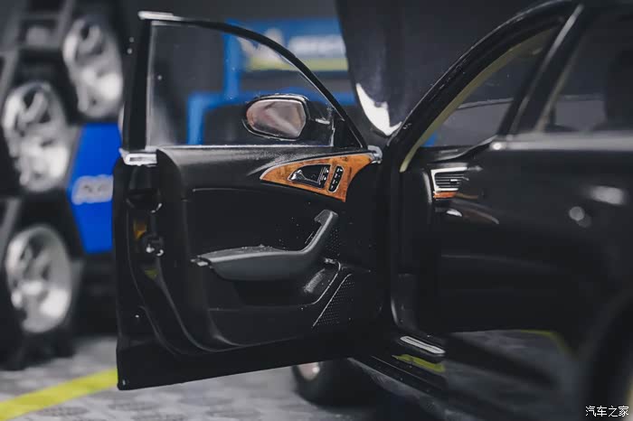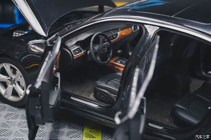 整车合金材质,分量足够,漆面也采用了真车一般的金属漆,阳光下可以看到金属颗粒,只是颗粒比较大有些失真,全车6开门,前后盖,四个车门都能打开,为了节省成本,前后均没有液压杆设计,后视镜也不能折叠,后期奥迪的模型基本都能折叠了。内饰细节也一般,不算精致,全车植绒,仿真度不错,值得一说后排中央扶手可以放下来,也算增加了一些可玩性吧,前大灯设计还算到位,透镜,日行灯清晰可见,尾灯就要差强人意,甚至有点走形,这都不算什么,最让人不能接受的就是他的18寸大轮毂,硬生生做成16的既视感,那轮胎厚的实在无法忍受,于是我后期给它换了一套RS5的轮毂就和谐许多了,下面一起欣赏一下吧