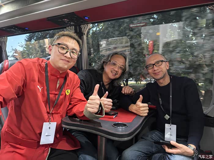 DAY3 跟全球媒体一起见证法拉利的电动车项目公布 ,坐上媒体大巴出发,旁边这大哥做了三十年汽车媒体,非常有经验的,我也看过他的视频