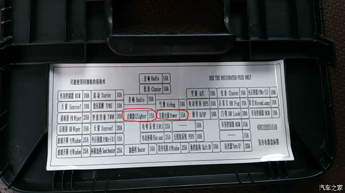 首先看一下保险盒盖子反面的图解,S5的点烟器和2个车载电源是分开的(红圈内的),而且都是ACC供电,车子熄火后会断电,这样比较安全,尽量不要从其他电器取电,,容易造成其它电器的故障,如果从顶棚灯取电的话,顶棚灯是常电,需要停车24小时监控的可以接顶棚灯。如果取ACC电的话从点烟器和车载电源是最安全的,不会造成其他设备的故障,而且平时电压器使用的频率也不高。