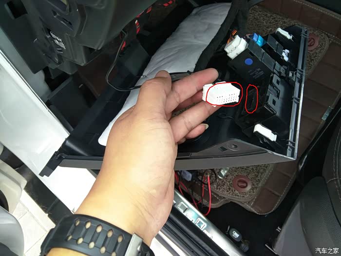 行车记录仪安好后,下面开始安装自动折叠后视镜模快,首先拔下后视镜控制接口,如下图: