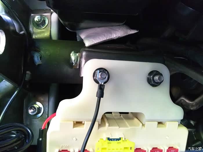 下面连接负极,但是在找接地端的时候就发现问题了,找了半天也没有发现接地螺丝,最后发现一个位置,就是固定保险盒2颗螺栓是焊在后面一个圆钢固定梁上面的,应该可以当做接地端,如下图: