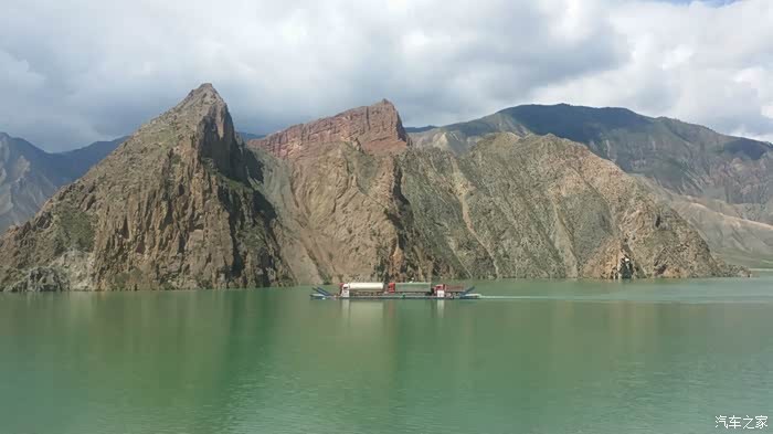 隆务峡口,水面上的拖船拉着运载水泥 砂石的土方车,在建设一条新的大桥。