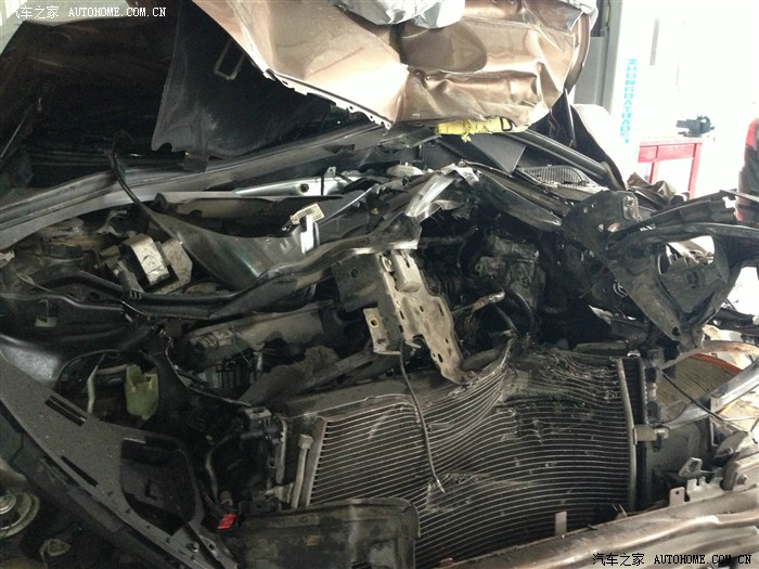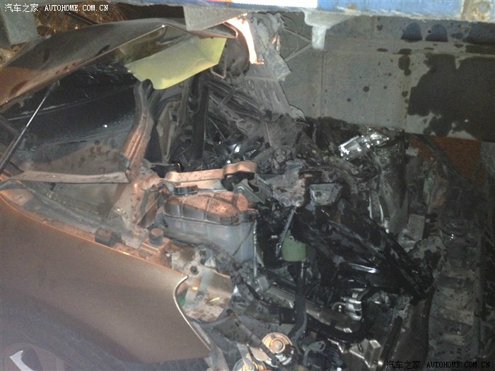 第二天去4S店查看,发动机仓几乎全毁,变速箱损毁、传动轴断裂、引擎缸体破裂。
