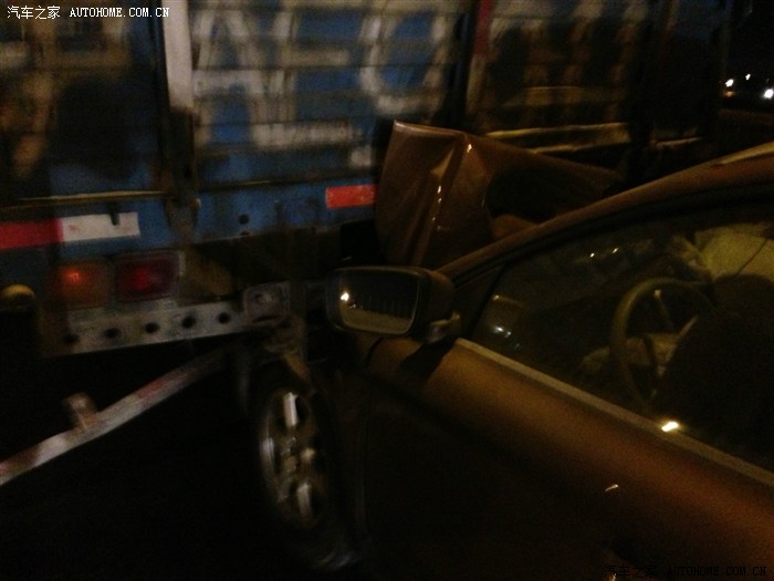 ,当视线再回到路面时,发现卡车屁股已经在眼前了,顿时感觉安全带收紧把身体死死的绑在了座位上,接下来便是一阵撞击声、气囊爆炸声。车舱内充满了气囊炸开的烟雾。呆了将近1秒,这时候车还在被拖着走,使劲刹车都没用,就这样被卡车拖行了将近20~30米、横跨了3根车道,在立交上最右侧车道停了下来。第一时间确认副驾驶上的媳妇,她和我一样也都没搞清是什么状况=_=...看着人没事,我心也定了。检查了下自己,手腕处被气囊擦破了皮,鼻子被气囊弹了一下(=O=)|||留了点鼻血(媳妇说当时我流鼻血问她有没有事的时候超像偶像剧,超感人
