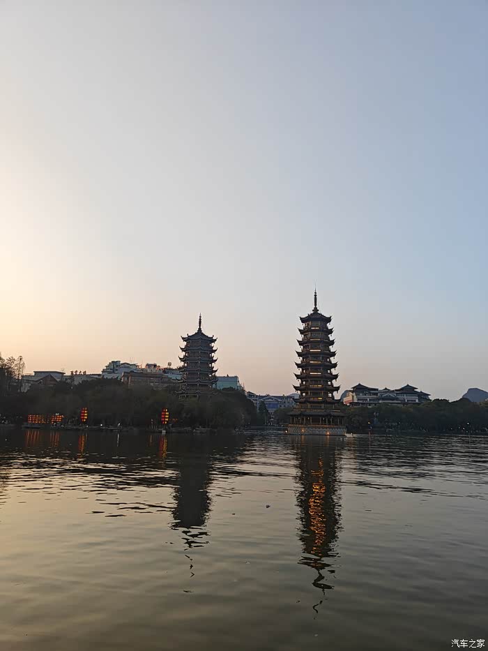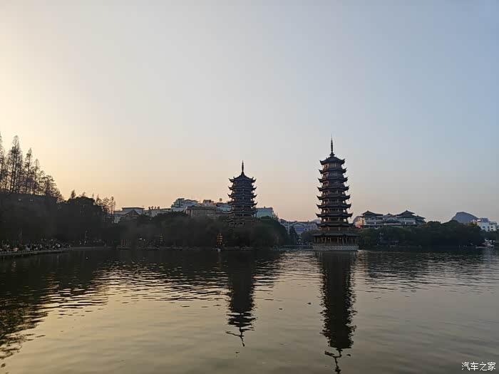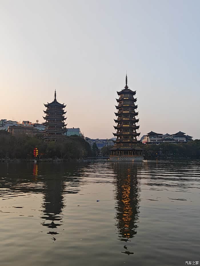 顺着路线走直接来到了桂林杉湖,湖中央树立着两座由纯铜打造的阁楼式山水塔,晚上会有灯光秀,发金色光的叫日塔,发银色光的叫月塔,所以就日月双塔,它是世界第一铜塔,还要浓厚的历史文化底蕴,拥有"儒释道"三教文化。
