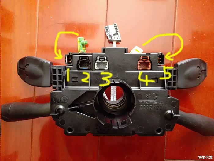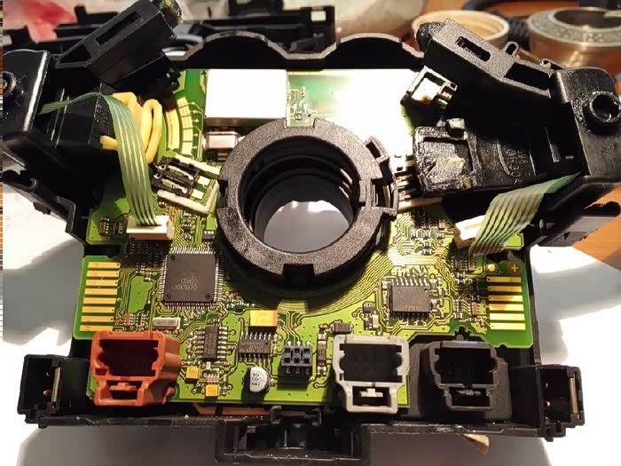 经过拆解,原车的接口二是一个位于电路板下面的装置,内置一片很薄的镂空圆形铜片,铜片上有一块电路板,感觉是测量角度的,转角传感器,照片我以后再拆下后补。关键是这个接口接不接和打火真的没关系。影响打火是接口四,红色的那个,那接口连着打火开关的解析芯片。