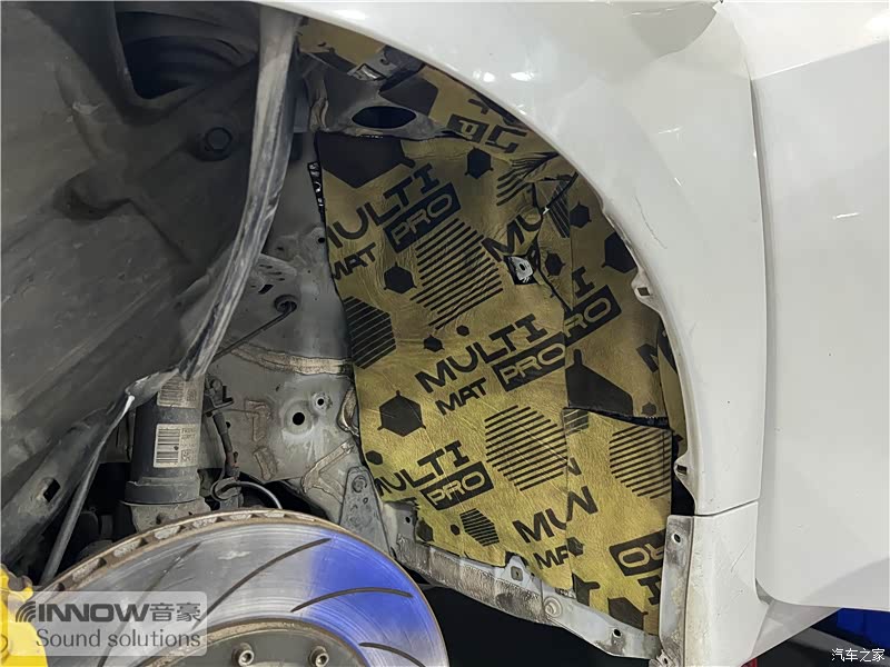 汽车行驶产生的路噪和胎噪,主要通过前轮翼子板传入到车厢内部。所以技师使用声学汉堡PRO对前轮翼子板做了吸音处理,它粘贴牢固,吸音效果出众,可以将大部分路噪和胎噪阻挡在了车厢之外。