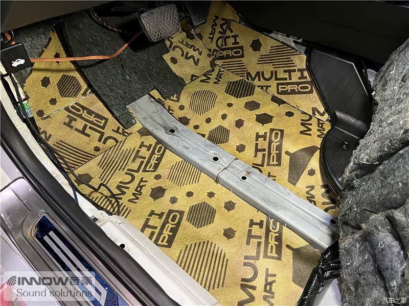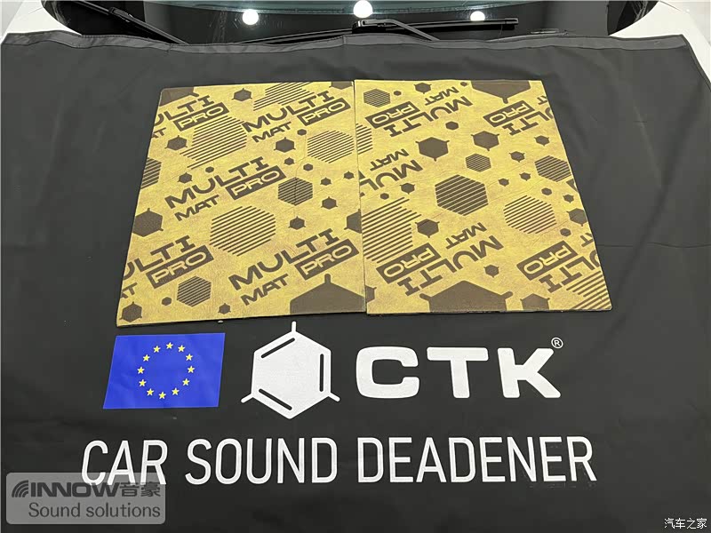 经过检测,技师发现原车的噪声主要有两大类,第一类是路噪和胎噪;第二类是来自发动机舱的噪声,因此技师使用欧洲环保隔音CTK,对汽车的前轮翼子板和仪表台下方,做了针对性的隔音处理。