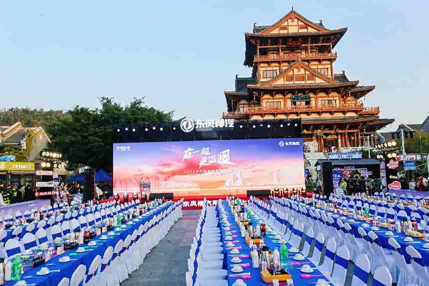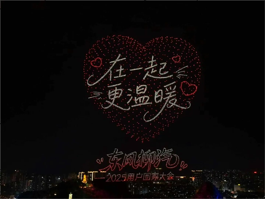 不过要说最震撼的,还得是晚上那场3500架无人机组成的灯光秀,这么多无人机一起上天,整齐地变出各种图案,我们还是头一回见。天上亮起“在一起,更温暖”的时候,心里确实很受触动,感觉这两天相处下来,和东风柳汽有了一种特别的连接,真挺像“回家”的感觉了。