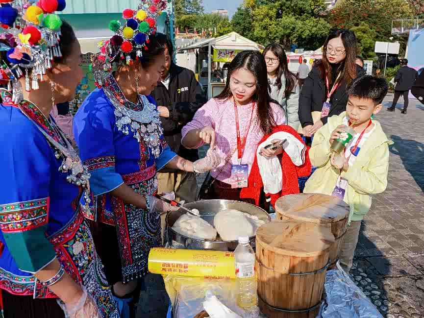 还有很多体验区,小孩坐着涂涂画画很有耐心,还可以自己打糍粑,小孩头回吃到现打出来的,又软又粘很美味,还有广西特色的油茶,在浓厚的茶里放上油炸的炒米,有一种把茶变成汤的感觉。这种能一起参与、动手、品尝的活动,确实比我们之前去景区光看表演有意思。