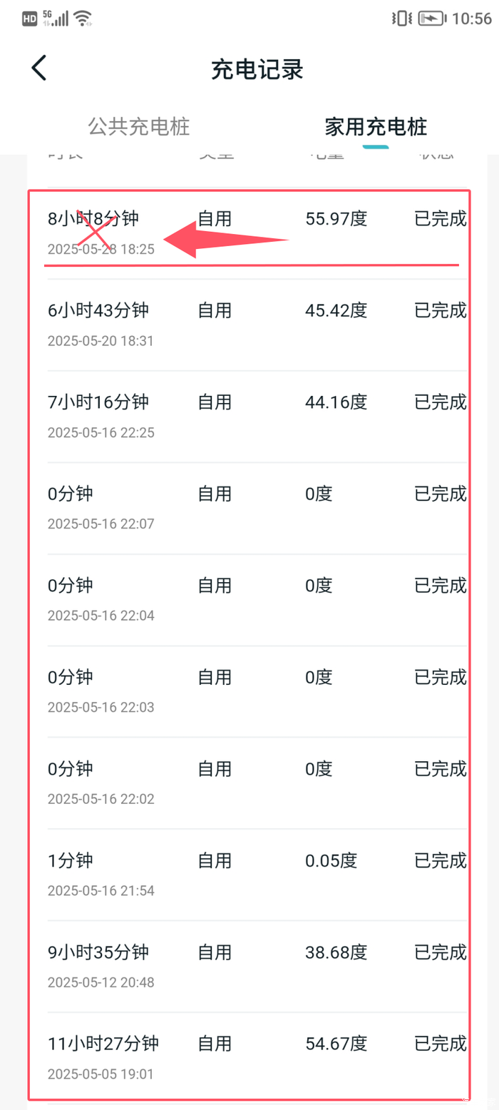 5月5日至5月29日之间充用电情况,其中5月28日充的电未在本统计时间段使用。