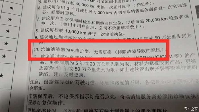 瑞虎8的汽油滤清器,车辆说明书里注明是免维护的,不需要更换,当然有故障要检修更换的除外。