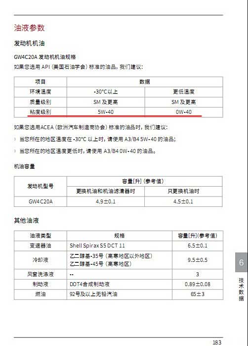 看到这里,想必大家应该明白我们VV7应该使用什么机油了吧。我们VV7配置的是一台2.0T排量的涡轮增压发动机,所以我们VV7应该加5W-40或0W-40的机油,这也是完全符合VV7使用说明书中的要求的。