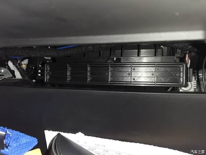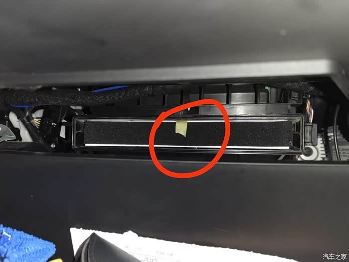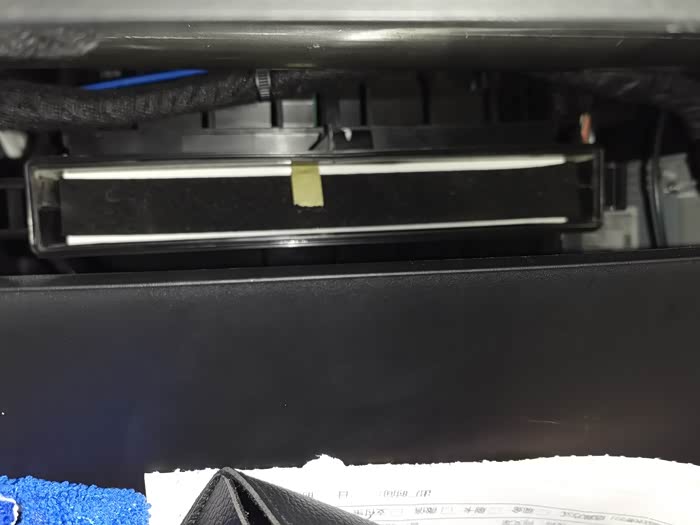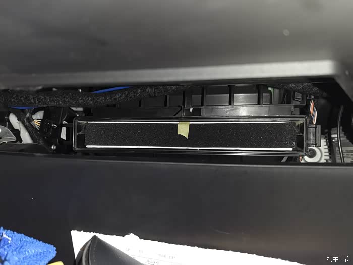 3、好多动手能力差的,或者懒的人几乎不知道空调滤芯在哪里,也懒得管懒得换,空调滤芯大多数车的包括这车的,打开副驾手套箱就看到了,在它背后,看到有一个长方形挡板,左面有个卡扣,伸一只手进去,用手捏着卡扣,就可以把它取下来了,就能看到滤芯了,抽出来就可以。避免下次不好抽出来,准备一小节胶带,贴上面,留个小尾巴,下次更换时拉胶带就出来了。超级省事,好换。下次拉这胶带旧滤芯就出来了,原车滤芯更软,不好抠出来。