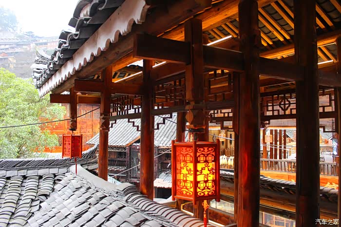 西江千户苗寨的木质吊脚楼依江而建,呈梯状逐级抬升,吊脚楼层层落落的与自然和谐共融。底层架空可以防涝防潮,还可以饲养家禽与放置杂物。
