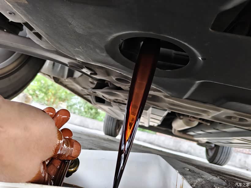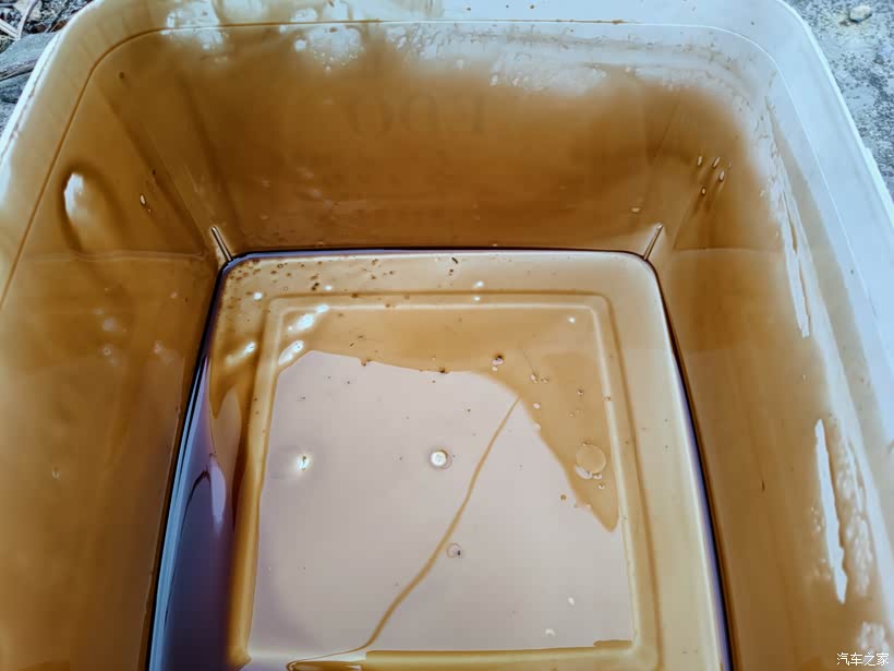 放出旧机油颜色呈酱油色,盛器底部有点沉淀物,也许是金属屑也许是拆放油螺丝从底盘掉下的沙子。
