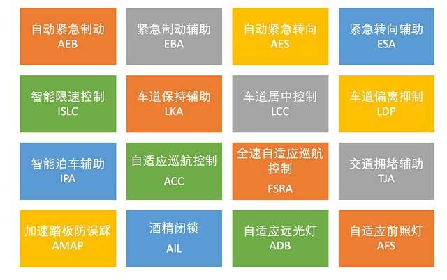 目前汽车主动安全技术包括ABS防抱死制动系统、EBD电子制动力分配系统、ESP电子稳定系统、TCS牵引力控制系统、FCW前撞预警系统、AEB自动紧急制动系统、RCW后向碰撞预警系统、RAEB后向自动紧急制动系统、LDWS车道偏离预警系统、LDP车道偏离干预系统、ESA紧急转向辅助、AES自动紧急转向、BSW盲点预警系统、LCA并行辅助系统、DOW开门预警系统、TPMS胎压检测系统,360度全景倒车影像等等。