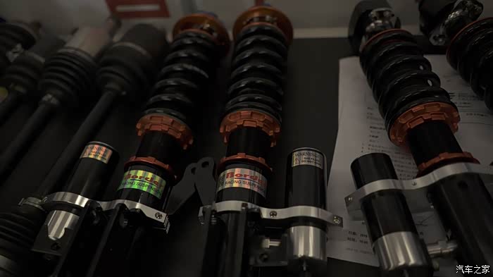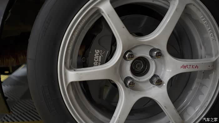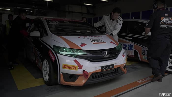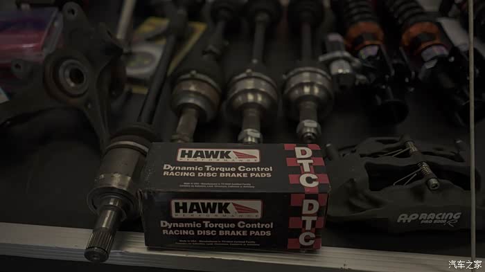 继续看看赛车,本站比赛汽车之家的车队是两台飞度赛车,左边的是601,代表汽车之家的生日。右边的是818,代表每年汽车之家的大事件日。桌上摆的改装件是这两台赛车的备用零件,让我十分惊讶的是汽车之家车队的赛车用的是来自台湾省的改装品牌 *** R1竞技避震! 正伟自己也是***的用户,看见赛车也用的*** 心中难免有些激动。 刹车选用的是赛车选用最多的AP 的竞技卡钳 5000R系列的大四活塞,刹车皮选用的是hawk竞技皮。 还记得我说过的吗? 竞技卡钳配竞技刹车皮,除了性能好没有别的用处,赛车 就该用这样的搭配。轮毂选用的artarka的旋压轮毂,正伟看到别的赛车也基本用的是artarka, 国产品牌耐用实惠 性价比高,感觉在不久的将来artarka可以做到和enkei rays齐名的地步。