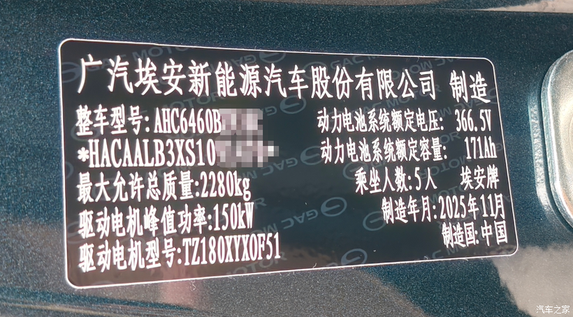 这个铭牌上没直接写电池类型,埃安AION V常用的是磷酸铁锂或三元锂电池,想确定的话可以看车辆的随车一致性证书,或者在车机的车辆信息里找找,也能联系售后查车架号对应的电池类型。