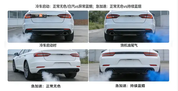 2. 判断标准:正常尾气为无色或淡灰色,无明显异味,排放量均匀;烧机油则尾气呈蓝色或蓝白色烟雾,轻踩油门,蓝色烟雾会明显加重。