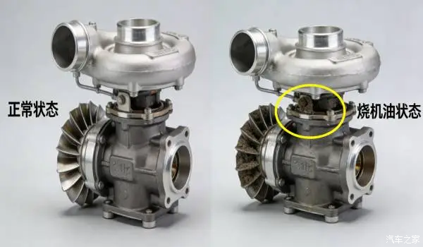 2. 判断标准:正常油管接口干燥、叶轮干净;烧机油则接口有机油渗漏,叶轮附着油膜和油腻积碳。