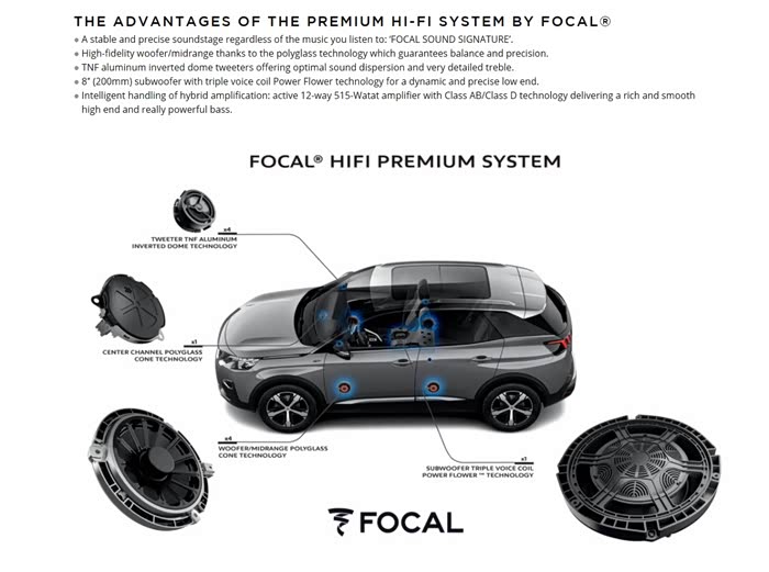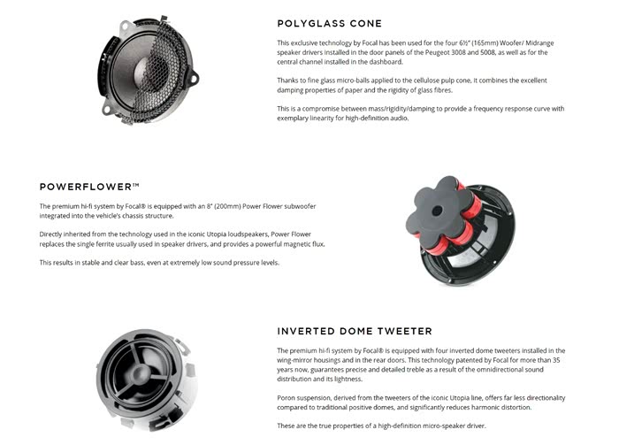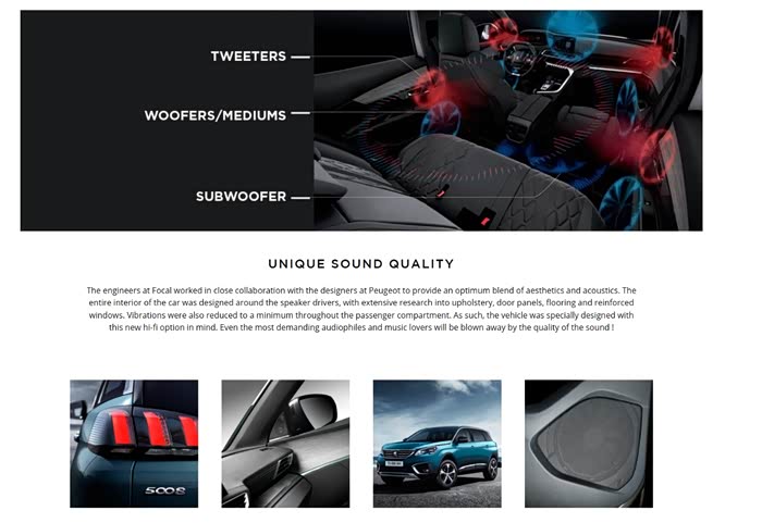 Focal的工程师与Peugeot的设计师紧密合作,提供美学和声学的最佳融合。 车辆的整体内部设计都在音响系统考虑范围内,对车内饰,车门板,车的地板和车窗强化都进行了广泛的研究。 将客舱内的共振抑制到最小。 因此,标致5008的车身在设计时就为这套FOCAL HI-FI高保真音响系统做了量身定制的优化。 即使是最苛刻的音响和音乐爱好者也将被高质量的声音表现所折服!