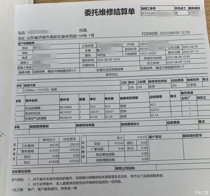 二保,基础保养花了610元,感觉也还可以的