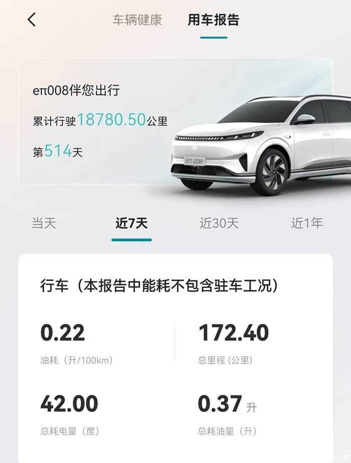 514天,18780公里,eπ008载着我和家人去过不少城市,尝过各地美食,也在本地周边的户外留下了很多欢乐时光。它不仅为我们遮风挡雨,守护安全,更承载了一家人太多美好的回忆。我觉得这就是一辆车最大的价值 —— 不是有多豪华,而是能陪着你奔赴每一段旅程,记录每一个幸福的瞬间。买 eπ008,我从没后悔过,它真的是一台值得家庭信赖的好车!