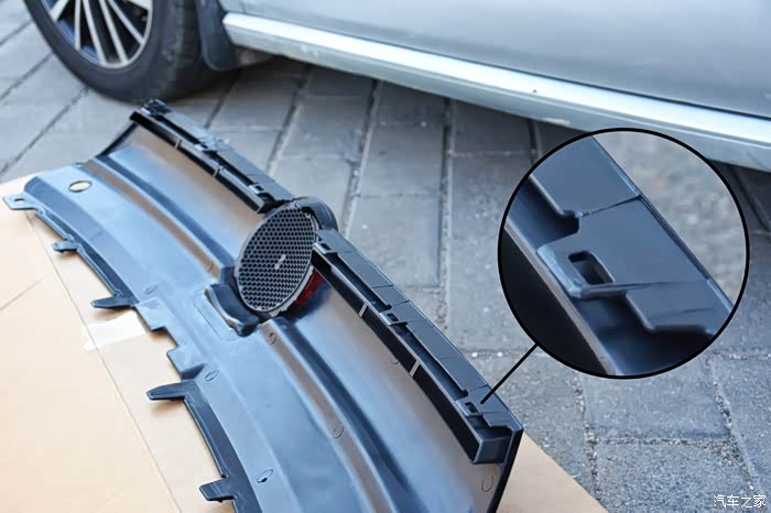 从改装件(亮黑色概念版中网)可以看出中网的固定是有几个卡扣固定的,那么这就可以证明出原车的中网固定方法