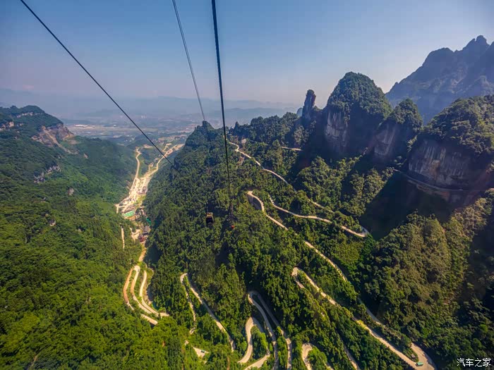 坐缆车上山时可以拍摄的天门山的全景,俯视天门山,九曲十八弯盘山公路。