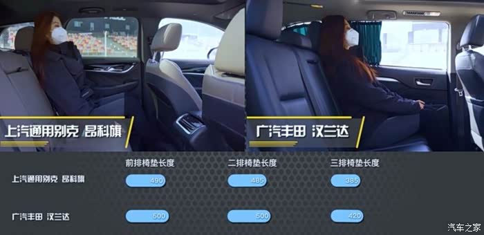 车内乘坐空间及舒适度方面,昂科旗和汉兰达各有千秋。虽然在实测数据方面,昂科旗的大部分空间尺寸比汉兰达稍有优势,比如第二排的腿部和第三排的腿部空间。尤其第三排的坐姿,昂科旗明显更加从容。但是由于昂科旗饱满且包裹感更强的座椅体积较大,视觉观感上反而没有汉兰达显得敞亮。