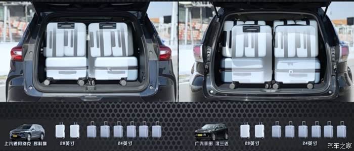 行李厢空间方面,无论是从实测数据还是实际旅行箱装载量来看,昂科旗都要完败给汉兰达。两车各自放倒第三排座椅,尽管都能装进六个24英寸、两个28英寸旅行箱,但装满行李箱后的剩余空间,汉兰达明显更有优势。