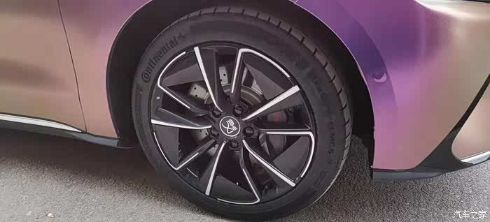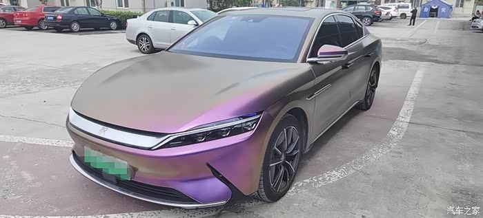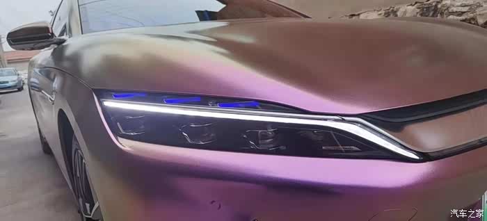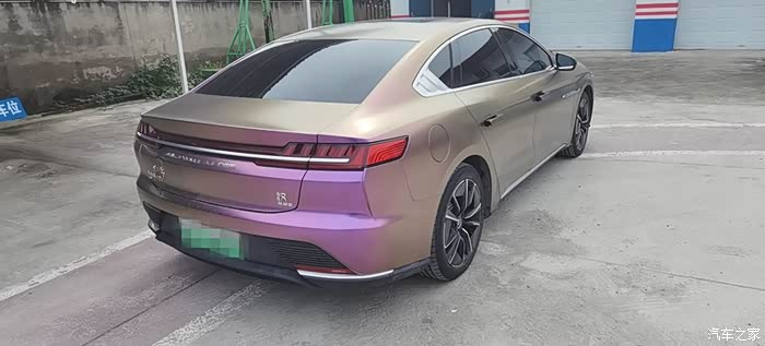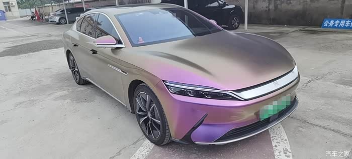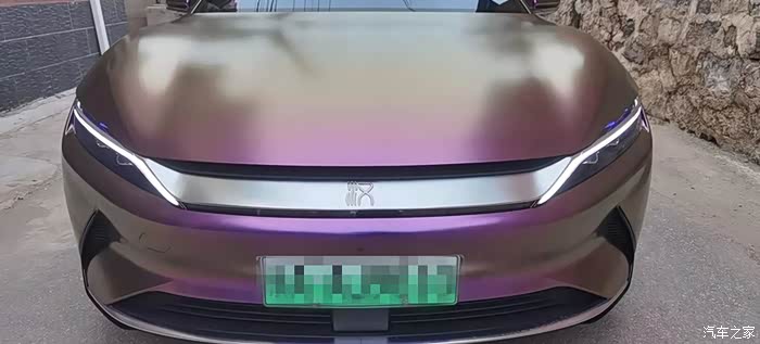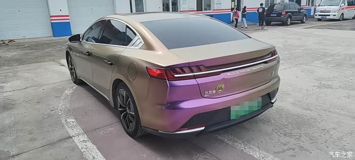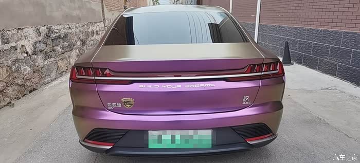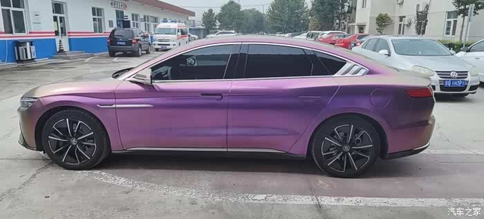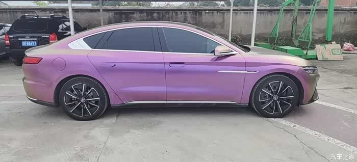 在坛子里泡了一年多,之前总是默默潜水,看大家踊跃发帖,这次也终于轮到我啦,因为我给自己的汉EV贴了个颜色很特别的车膜。我这辆车是20款四驱高性能旗舰型,原本的车身颜色是红色,现在贴成了砖石酱紫色。这个颜色的膜最特别的一点就在于可以根据光线的角度变换不同的颜色,远远看齐色彩很斑斓,同时又有着金属的质感,不得不说和汉EV这酷酷的风格简直太配了。