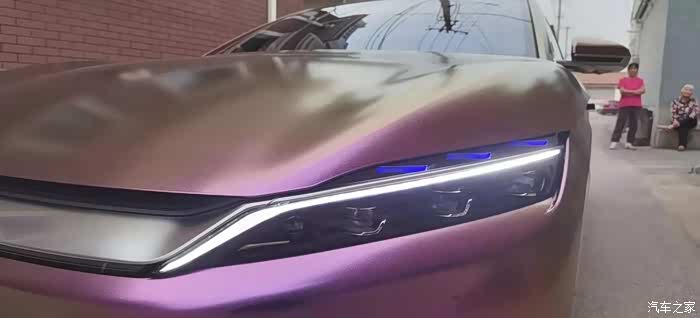 矩阵式大灯在白天的时候只有日行灯的灯带亮着,整个日行灯的线条和前脸贯穿的银色装饰条融为一体,看起来很协调很流畅,矩阵大灯还泛着蓝紫色的光,和膜的颜色也呼应起来了。