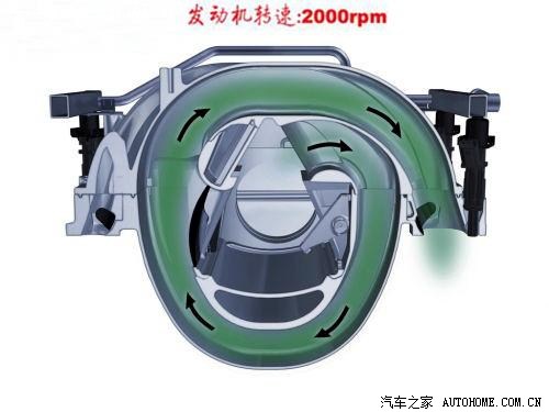 工程师通过改变进气歧管长度,改进气流的流动。进气歧管被设计成蜗牛一般的螺旋状,分布在发动机缸体中间,气流从中部进入。当发动机在2000prm低转速运转时,黑色控制阀关闭,气流被迫从长歧管流入汽缸,此时,进气歧管的固有频率得以降低,以适应气流的低转速。当发动机转速上升到5000rpm,进气频率上升,此时控制阀开启,气流绕开下部导管直接注入汽缸,这降低了进气歧管的共振频率,利于高速进气。