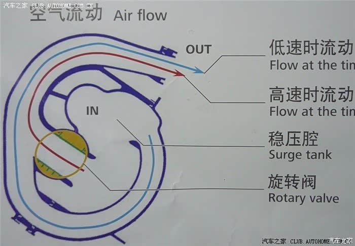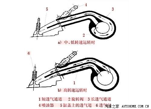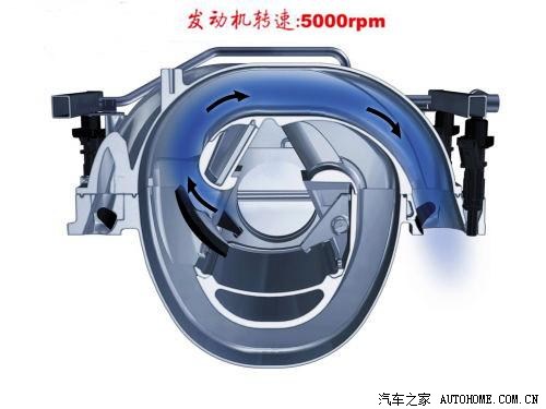 发动机在低转速时,用又长又细的进气歧管,可以增加进气的气流速度和气压强度,并使得汽油得以更好的雾化,燃烧的更好,提高扭矩。(就像捏扁水管后,水流就会更有力)发动机在高转速时需要大量混合气,这是进气歧管就会变的又粗有短,这样才能吸入更多的混合气,提高输出功率。