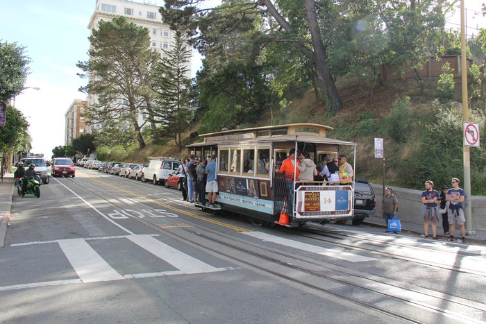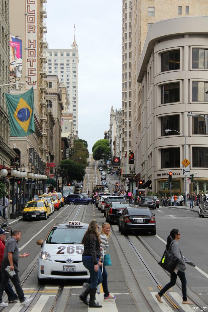 初到旧金山的第一反应就是:终于逃离雾霾了,确实这也是大多数人走出国门下飞机后的第一反应,第一天由于主要行程就是在海湾边逛游并没有出城的计划就没有租车,酒店定在轮巴顿街的surf inn(有兴趣的网友可以参考booking网站)距离渔人码头步行20分钟左右,于是出了机场乘坐burt(旧金山地铁简称)至市中心转乘公交到酒店,放下行李后就开始了第一天的旧金山城市徒步旅行,旧金山的城市地貌很有特色,和国内的重庆类似都是山城的格局,有些道路的坡度相比重庆有过之而无不及