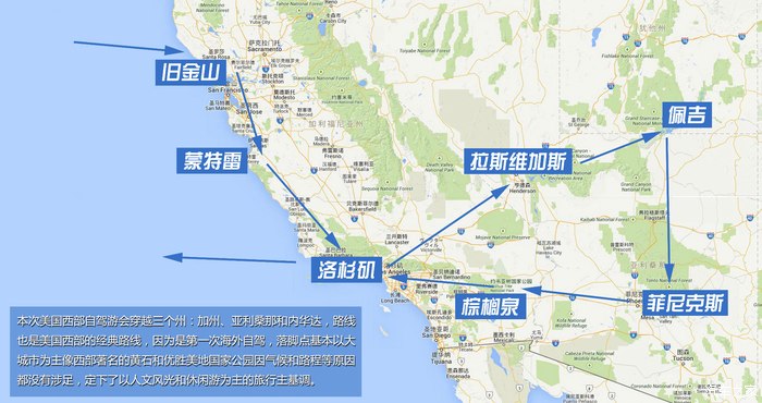 本次美国西部自驾游会穿越三个州:加州、亚利桑那和内华达,从旧金山入境,洛杉矶离境全程约4000公里,路线也是美国西部的经典路线,因为是第一次海外自驾,落脚点基本以大城市为主像是著名的黄石和优胜美地国家公园因为气候和行车路线等原因都没有涉足,定下了以人文风光和休闲游为主的旅行基调。