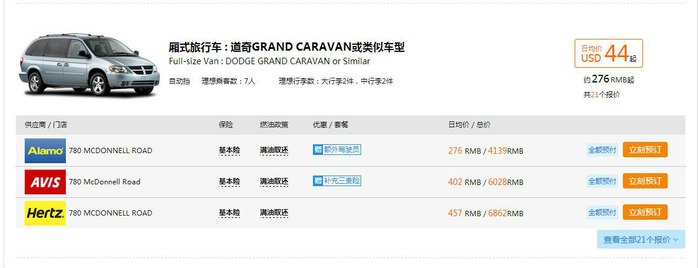 在国内进行国际租车的渠道渠道有很多,主要有三个1、官方网站(最著名的就是avis和herz,在官网上都可以通过中文直接进行);2、租租车网站、3、携程旅行网。选择租车渠道的方式无论选择哪一种都可以方便的租到理想的车型,因此决定通过哪种方式来租车的重要因素就是租车价格,通过多方面对比国内的租租车和携程两个网站的价格都要比官网便宜一些,而且租车公司品牌选择范围更大(事实证明Alamo和dollar的价格相比herz这样的大品牌要实惠得多)。综合考虑最终通过携程旅行网租了Alamo公司的mpv车型日租价为44USD,加上5USD每日的救援险总价为49刀/天,相对于国内的租车价格还是相当优惠的(要知道我们租的车型在国内的售价可是五十多万配备3.6panterstar发动机的大捷龙,而且电动侧门电动尾门等高端配置一应俱全)