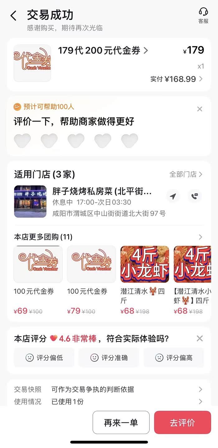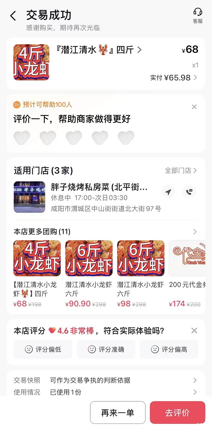 作为靠烧烤起家的老店,他家烤肉还是比较正宗的,闭眼点不踩雷!但是小龙虾味道一般,但是价位比较便宜。我们4个人狂炫一顿才花了335.18元!用了抖音179代200的代金券,小龙虾单独团购享受68元4斤的优惠,性价比还可以,咸阳的宝子们,没吃过胖子烧烤的可以去尝尝,约上你的饭搭子尝尝地道的美味。
