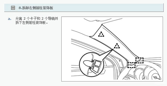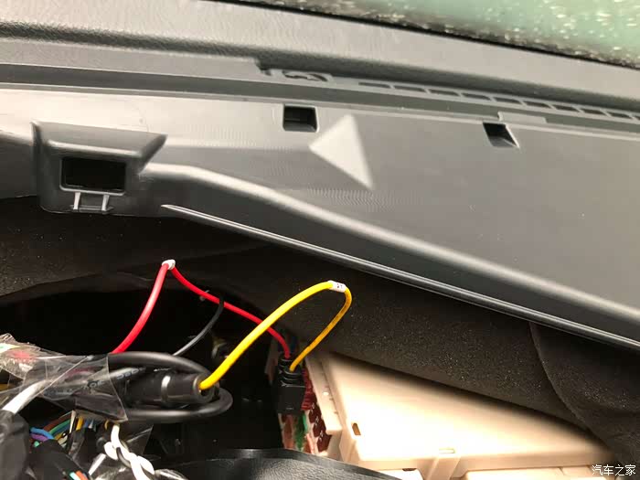 后面就是行车记录仪的走线了。基本都是这样走的了,沿驾驶员的A柱连至车内后视镜附近的行车记录仪,不难。只需要拆掉A柱的装饰板,徒手或者用撬子就能撬开A柱的装饰板,很简单,就2个卡扣,稍微大力点就能掰出来。