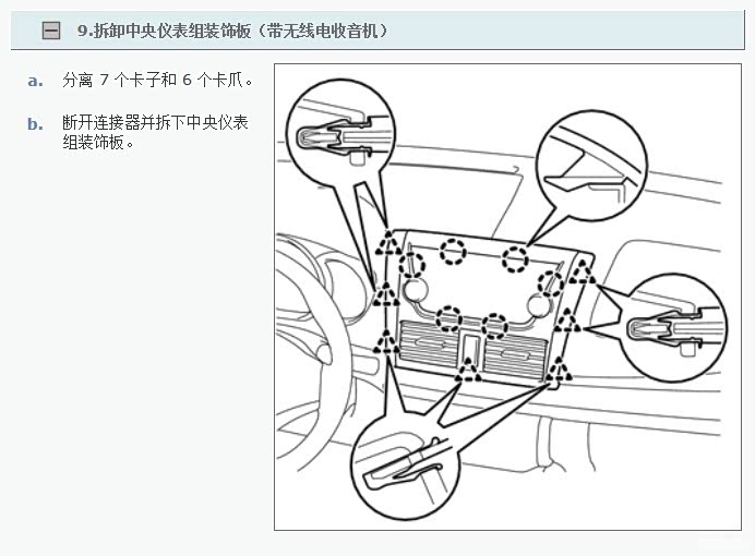 第一步要做的是拆开中间的仪表组(就是收音机的那个东西),都是卡扣,用力拔就行了。
