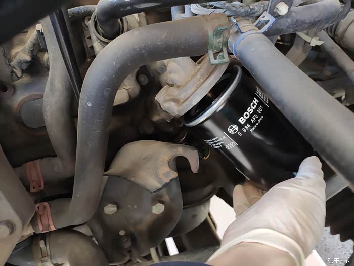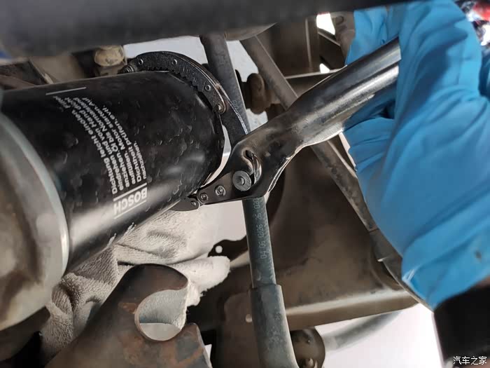 12.把新滤芯拧回去。手动拧紧后用扳手紧一下即可,不要太用力。