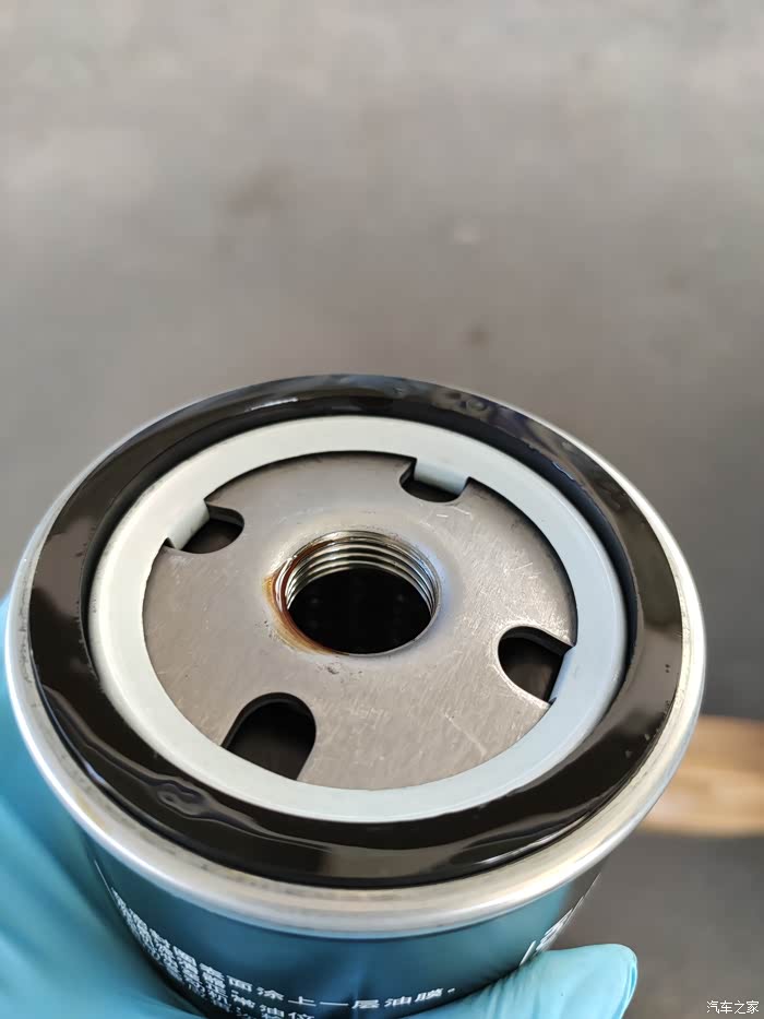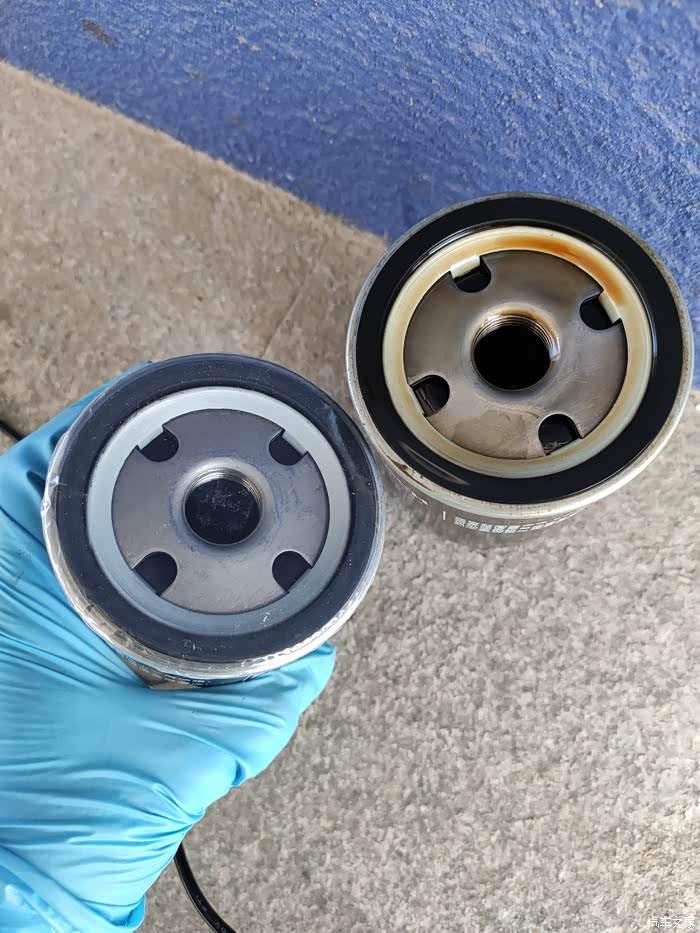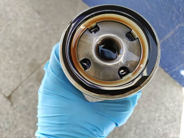 4.拆下来的旧滤芯。这里一定注意胶圈下没下来,不要留在发动机滤芯底座上。不然和新滤芯的胶圈重叠,一点火会喷油出来。里面有机油不要撒了,倒进旧油回收桶里。大概能有300ml?不要忘了加进旧油量统计里。(抽多少出来倒多少进去)