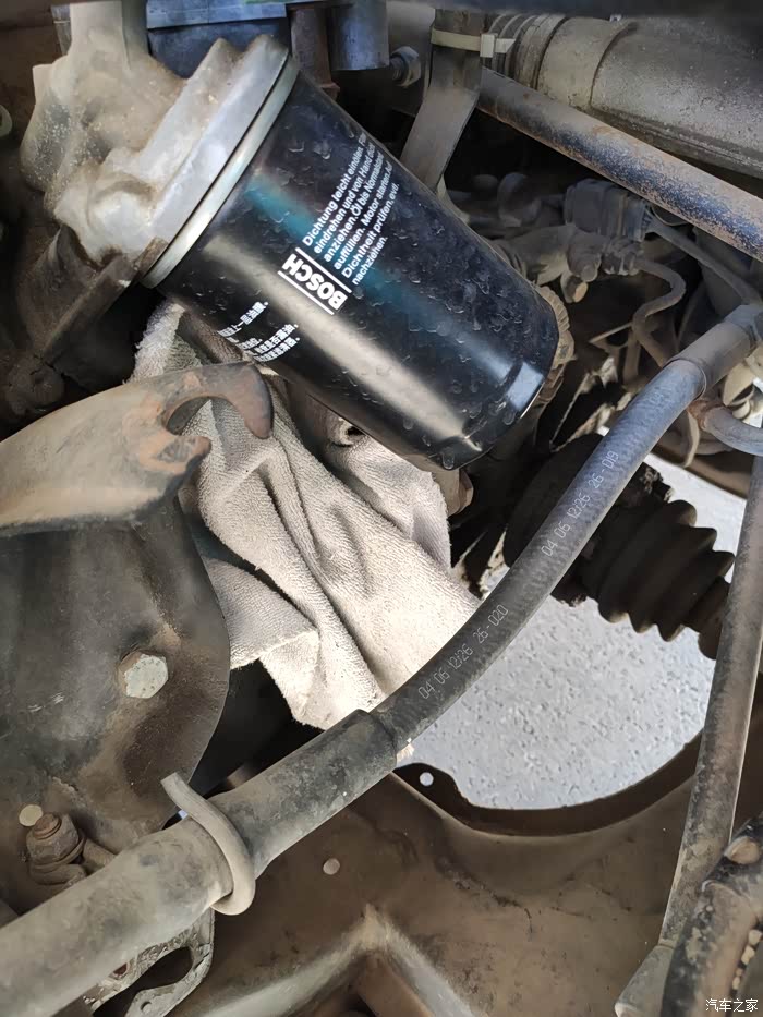 2、准备拆机油滤芯。用一块抹布垫在滤芯下方,以免滴落,弄脏下方零件。