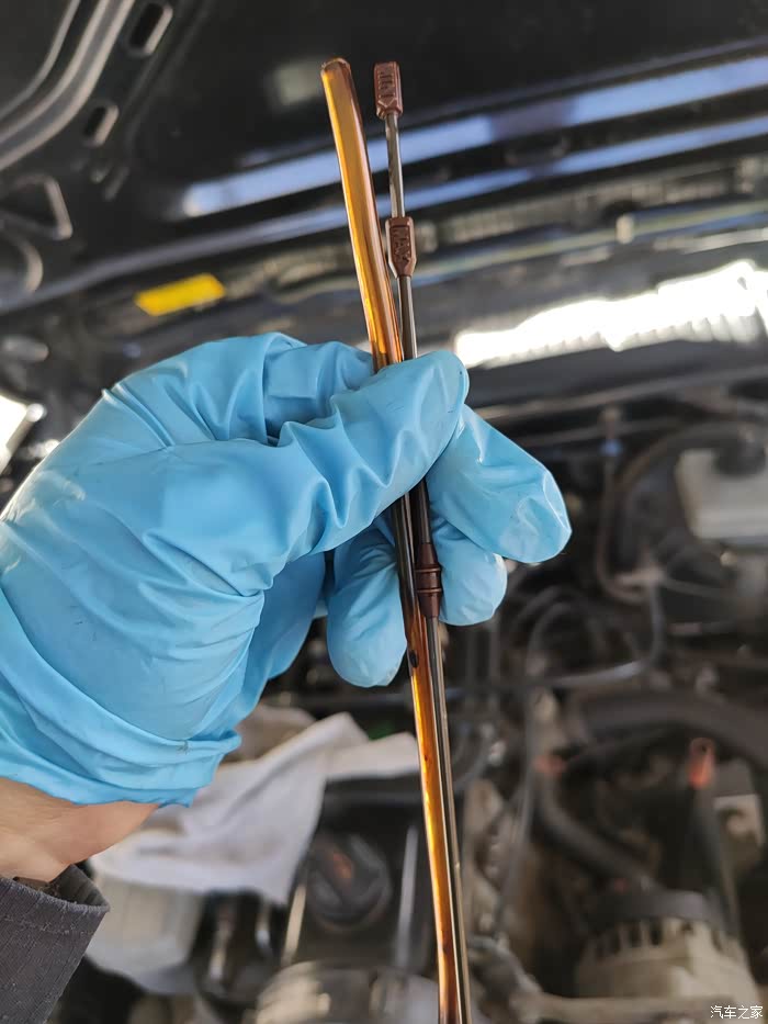 14.盖好机油盖。点火怠速到水温90度熄火。看一下油尺。和换之前的量一致。完美结束。