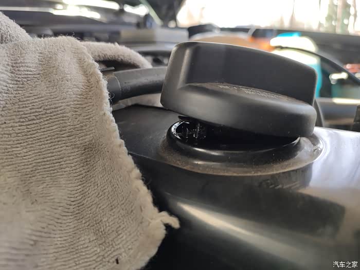 5.把机油口盖子拿下来,再这样放回去。留个缝通气,让抽油顺畅。