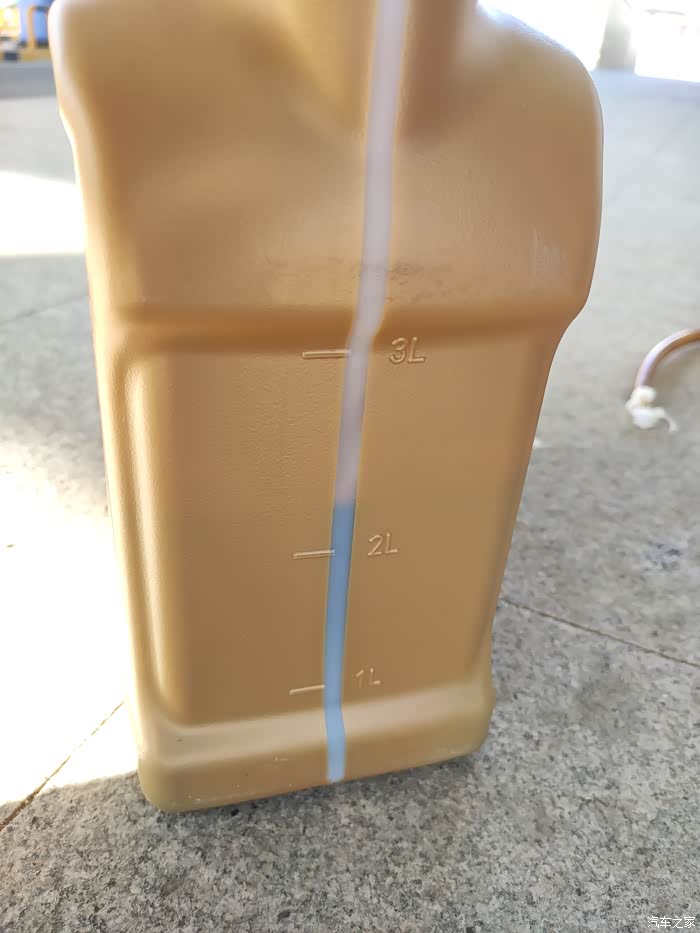 10.旧油量统计。把滤芯里的也倒出来。一共抽了2.5升。抽的很干净。普桑的标准机油量是3升。我只加到了油尺刻线的中间,就是2.5升。抽油结束,抽出抽油管,收好抽油泵。油泵两端用纸塞住,防止残存的油漏出来。收到库房之前接一盆热水,抽几次热水,把管路里残存的油冲洗干净。