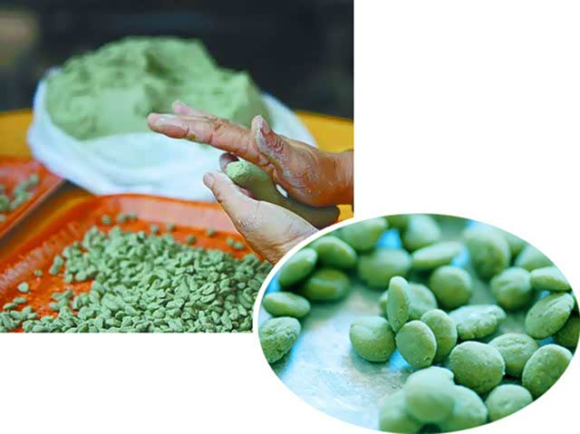 芒果肠粉晶莹剔透、皮滑肉嫩、入口即化。它以熟芒果为馅,以椰浆粉皮为面,将芒果与椰子巧妙的结合起来。海南的芒果肠粉兴起于琼海,采用天然健康的食材,独特的制作工艺,别具一格的搭配并且美味而闻名。 这道甜品的独特在于巧用椰浆、澄粉与牛奶混合,煮干后结皮,匠心独具地制成了柔软嫩滑如凝脂般的雪白肠粉。恰逢芒果丰收季,大块新鲜甘甜的熟芒果肉成为了最好的馅料。椰香味的肠粉皮裹着芒果肉,卷成肠状上碟,再淋上冰冻芒果汁即可。口感似啫喱,又比啫喱少了一份晶莹剔透,更多的是滑嫩如丝,柔软沁甜的甜蜜漫天袭来。 价格:15元左右 鸡屎藤粑仔 鸡屎藤粑仔,海南本地人大多简称它为鸡屎藤,这是海南最具乡土气息的小吃和滋补品,不雅的名字,却有独特的美味。在海南的部分地方,鸡屎藤是本土居民房前屋后,田头山里随处可见的一种野生植物,经过特殊的制作,它便变成了一粒一粒爽口的翠绿的小疙瘩。“色形香味都很迷人,真是一种绝妙的点心!”美食家这么评价它。